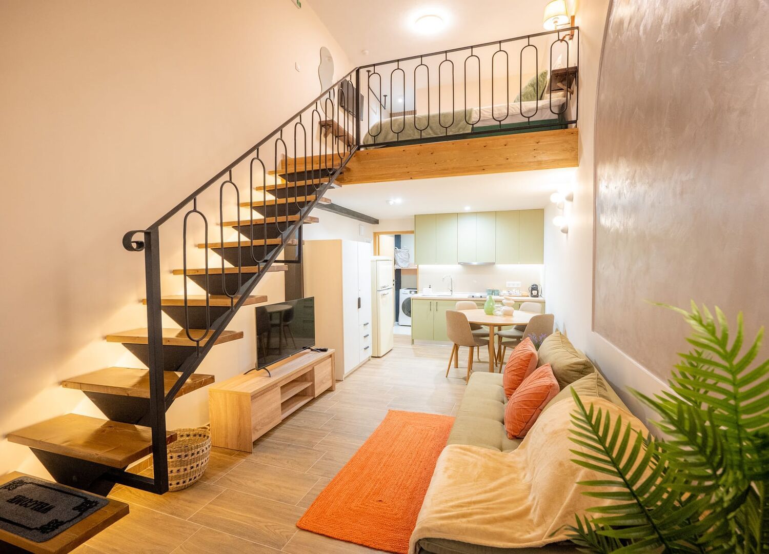 Loft 1 accommodates up to 4 guests, while Loft 2 hosts up to 5. Both are open-plan with a mezzanine level and include a fully equipped kitchen (coffee maker, kettle, toaster, cookware, utensils), two bathrooms (one on each level), high-speed Wi-Fi, smart TVs with streaming service access, air conditioning, iron, and a washer-dryer.